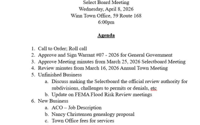 Selectboard meetings have been changed to Wednesday evenings, next one will be April 22nd @ 6pm.